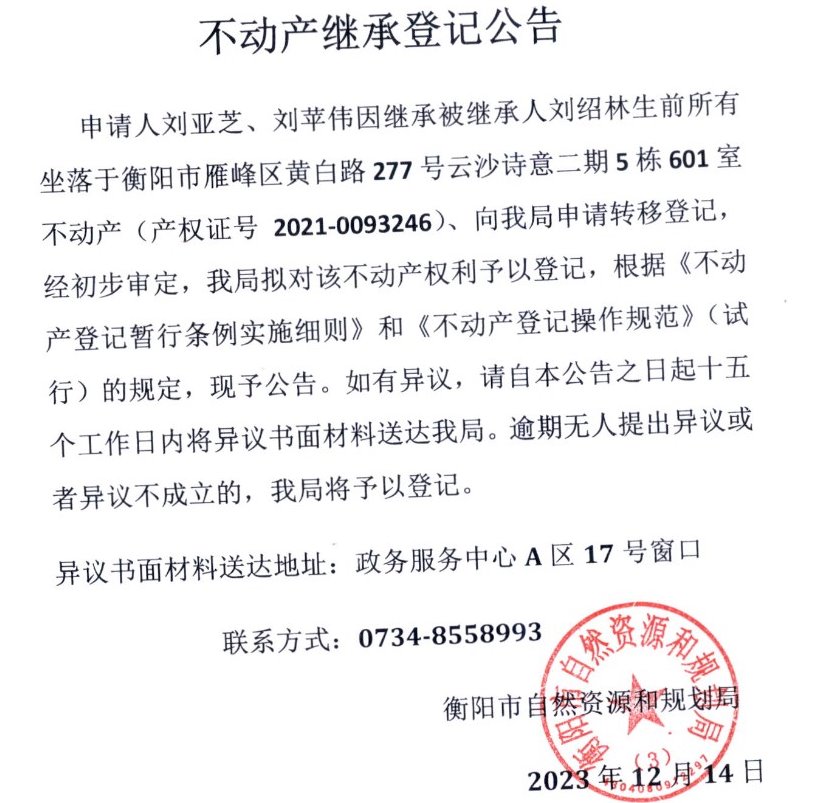 关于刘亚芝、刘苹伟继承刘绍林不动产登记的公告