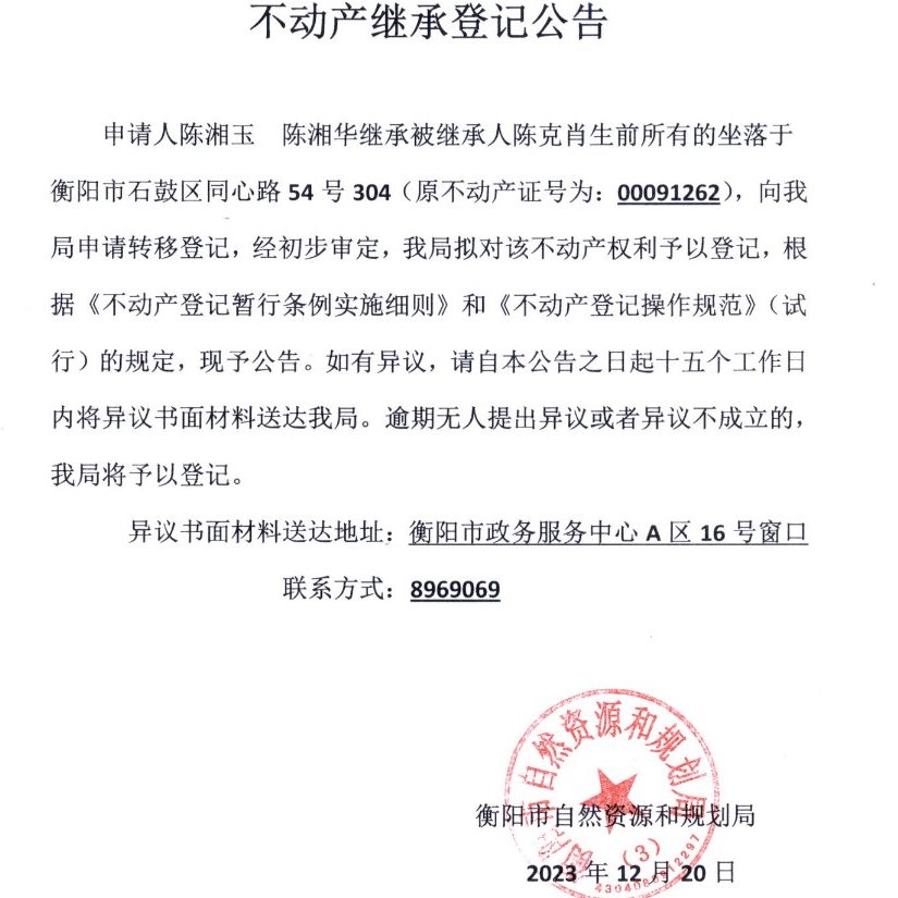 关于陈湘玉、陈湘华继承陈克肖不动产登记的公告