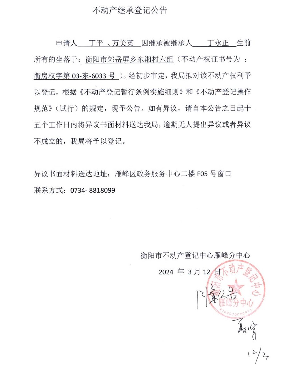 关于丁平、万美英继承丁永正不动产登记的公告
