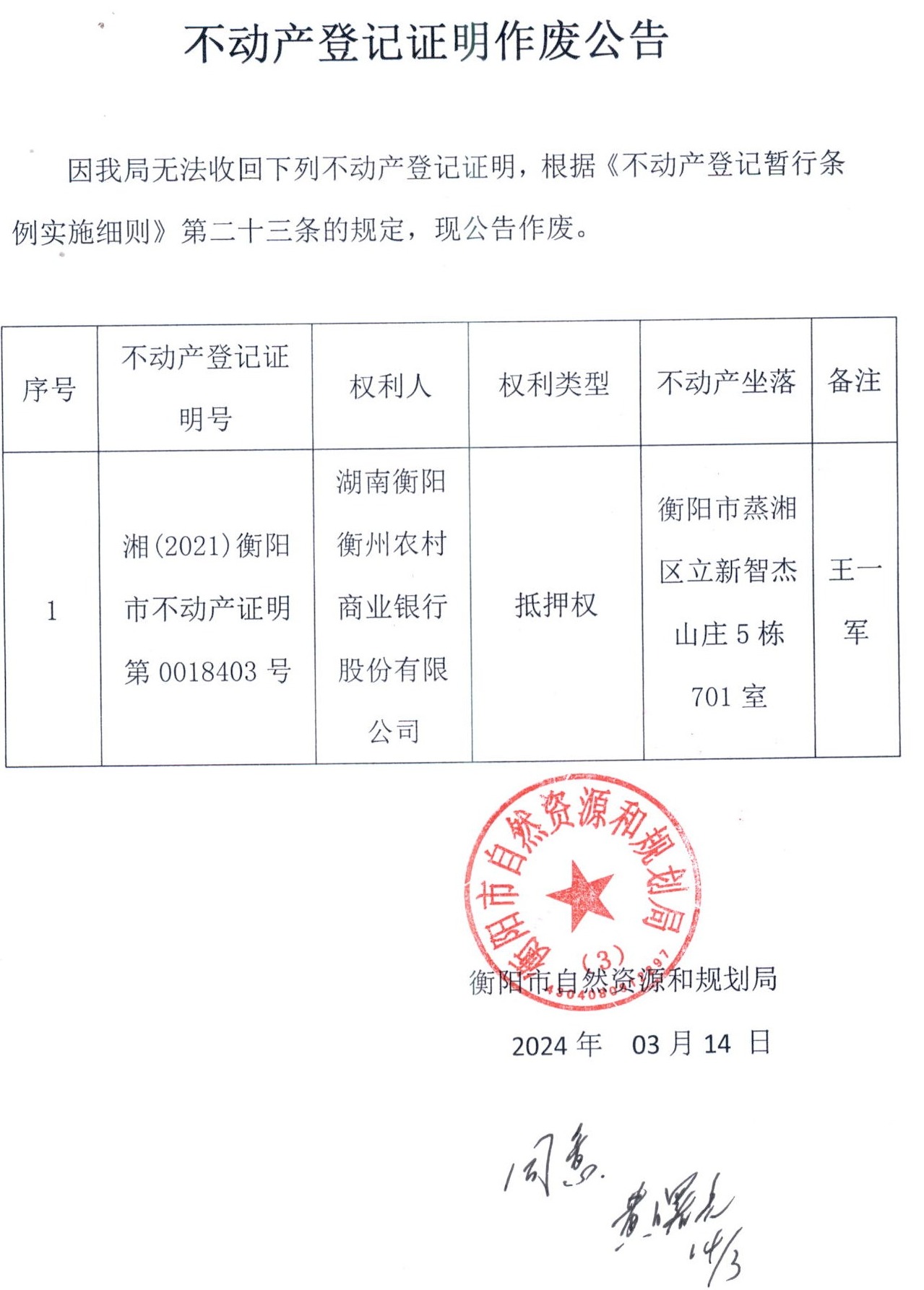 关于湖南衡阳衡州农村商业银行不动产登记证明作废的公告