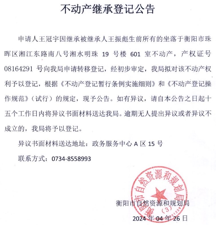 关于王冠宇继承王振彪不动产登记的公告