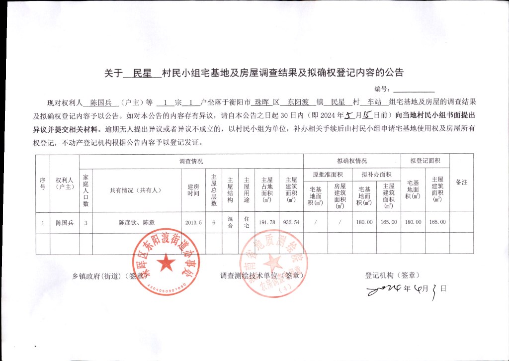 关于民星村车站组陈国兵宅基地及房屋调查结果确权登记公告
