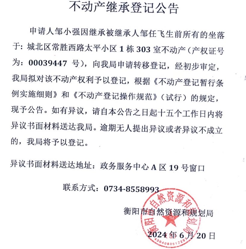 关于邹小强继承邹任飞不动产登记的公告
