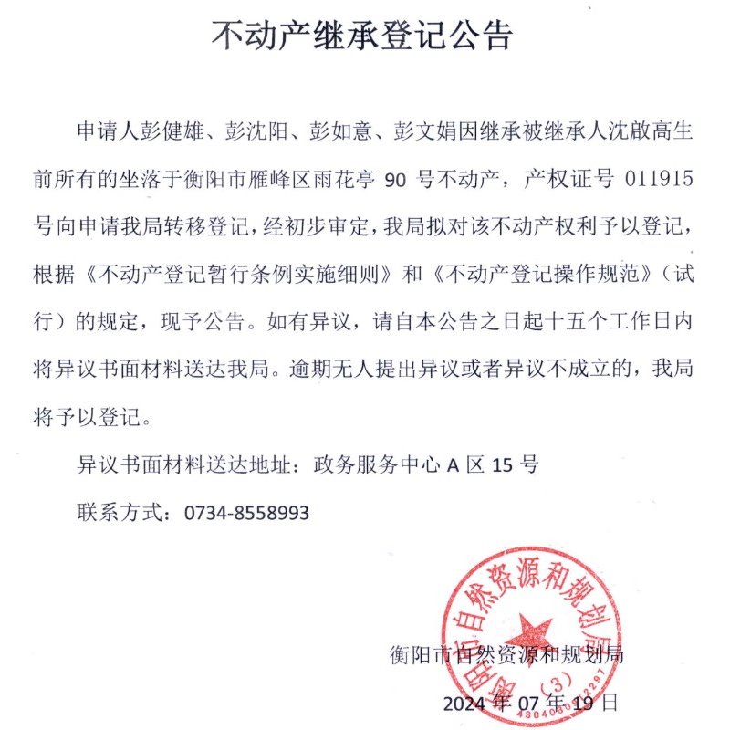 关于彭健雄、彭沈阳、彭如意、彭文娟继承沈啟高不动产登记的公告