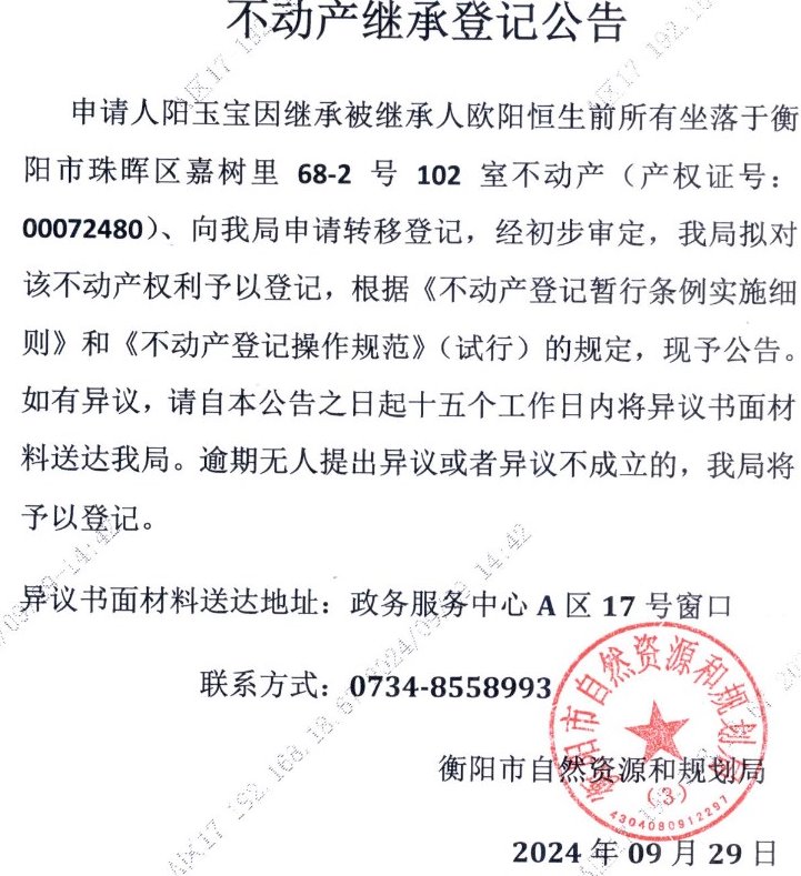 关于阳玉宝继承欧阳恒不动产登记的公告