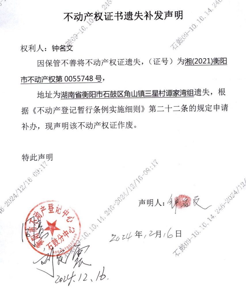 关于钟名文不动产权证书遗失补发声明的公告