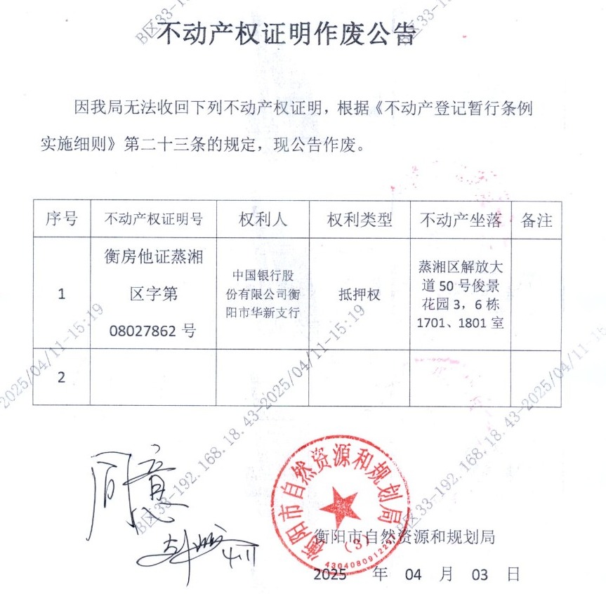 关于中国银行股份有限公司衡阳市华新支行的房屋他项证明遗失声明的公告