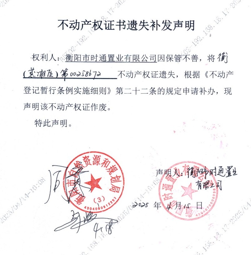 关于衡阳市时通置业有限公司不动产权证遗失声明的公告