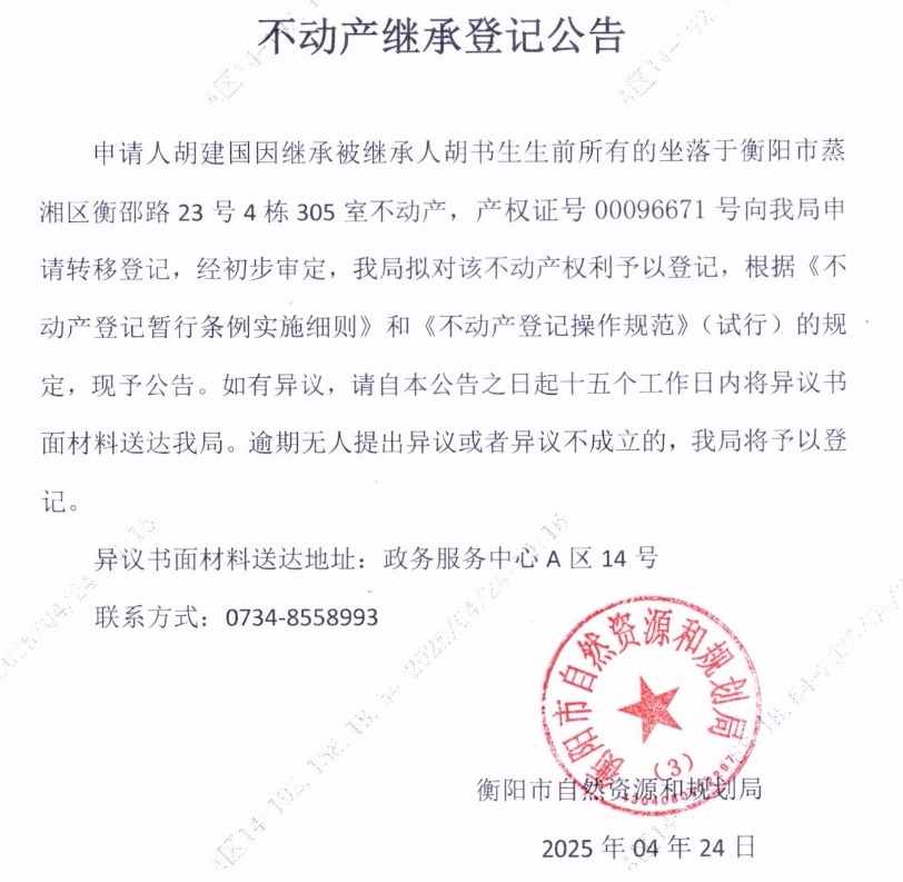 关于胡建国继承胡书生不动产登记的公告