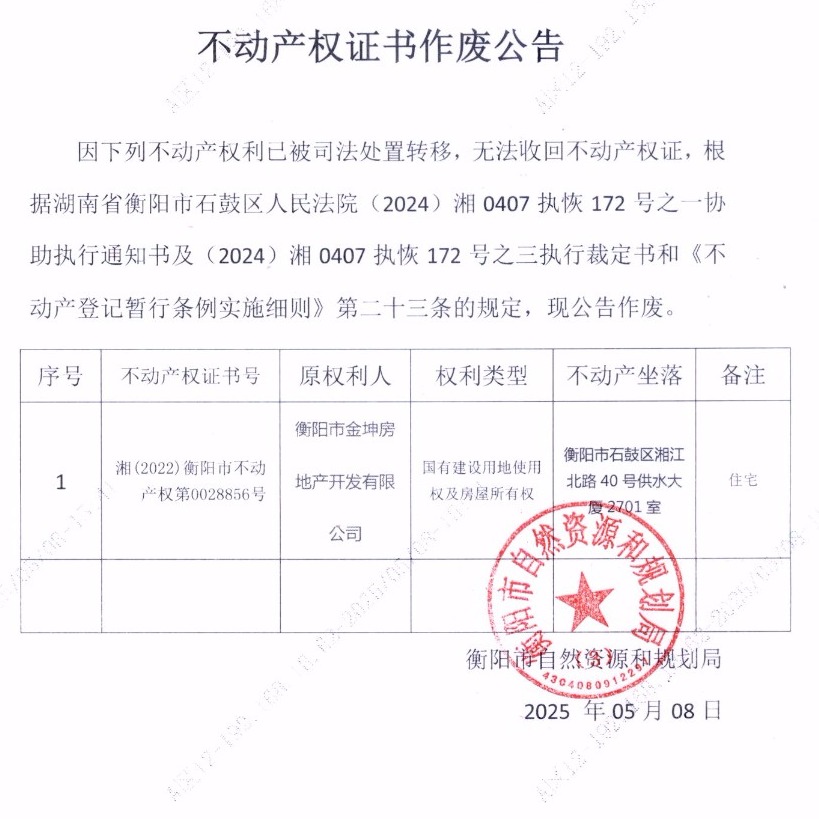 关于衡阳市金坤房地产开发有限公司不动产权证书作废的公告