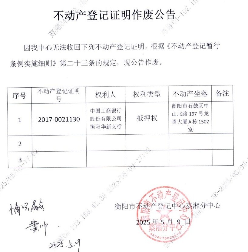 关于中国工商银行股份有限公司衡阳华新支行不动产登记证明遗失声明作废的公告