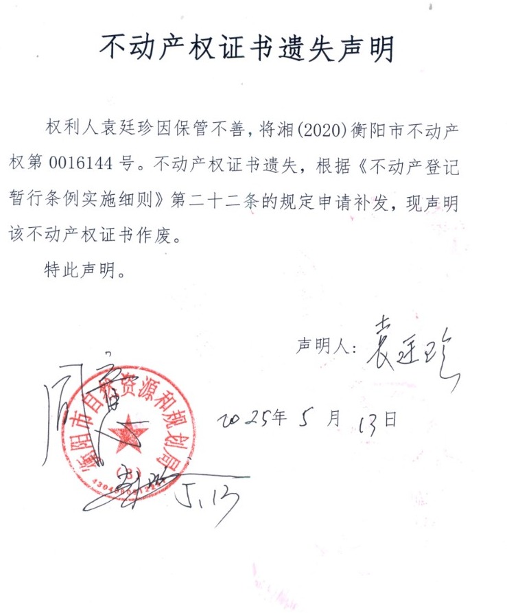关于袁廷珍不动产权证书遗失声明