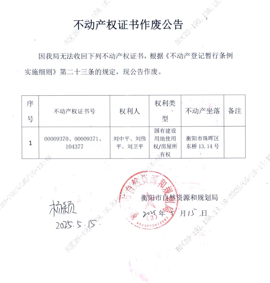 关于刘中平、刘伟平、刘卫平不动产权证书作废公告