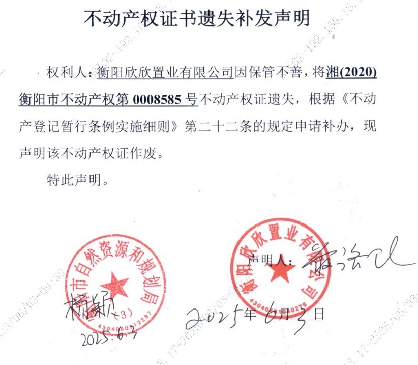 关于衡阳欣欣置业有限公司不动产权证遗失声明的公告