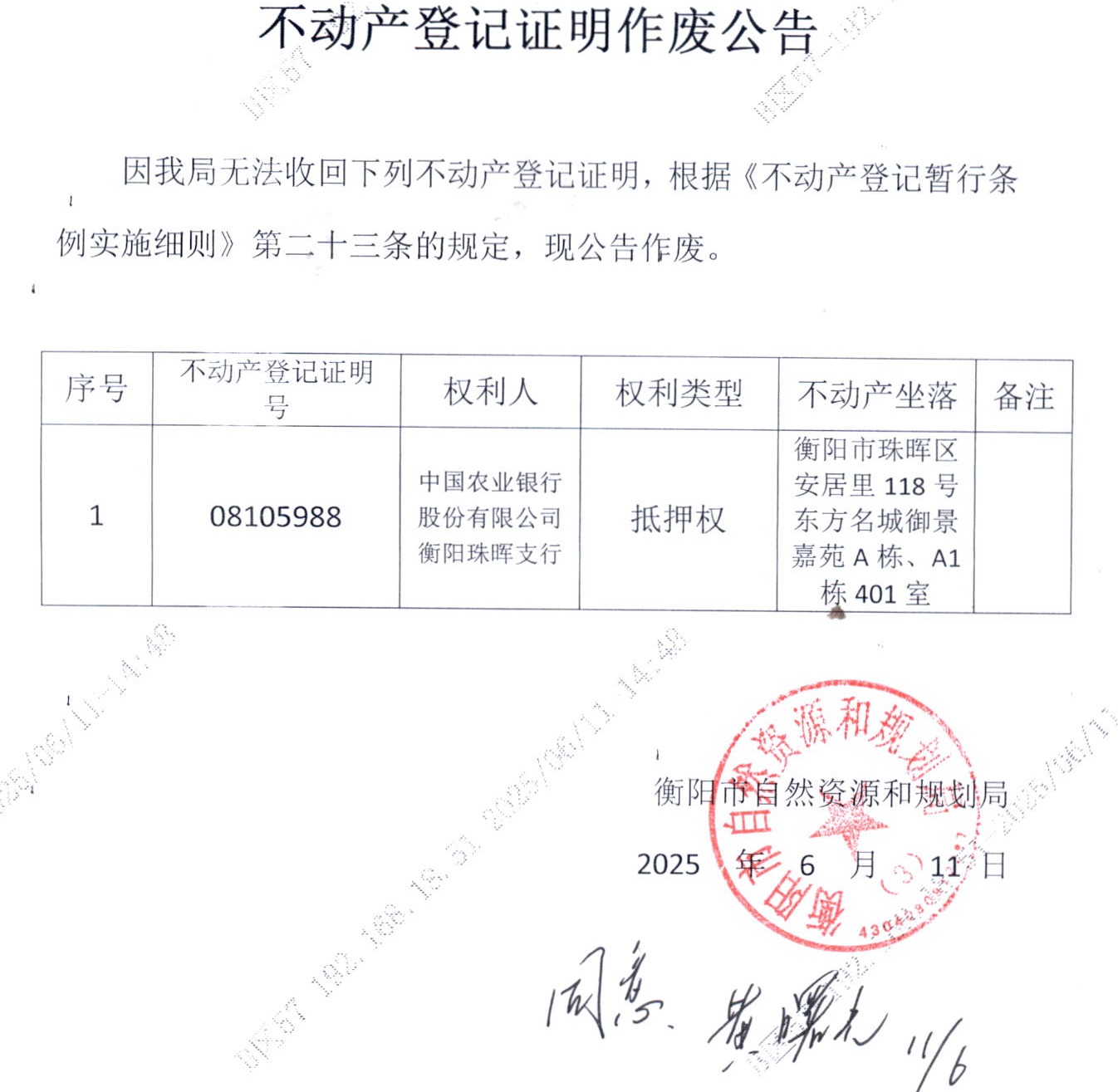 关于中国农业银行股份有限公司衡阳珠晖支行不动产证明作废的公告
