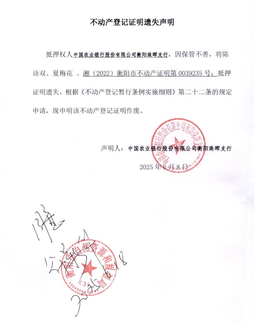 关于中国农业银行股份有限公司衡阳珠晖支行不动产登记证明遗失声明作废的公告