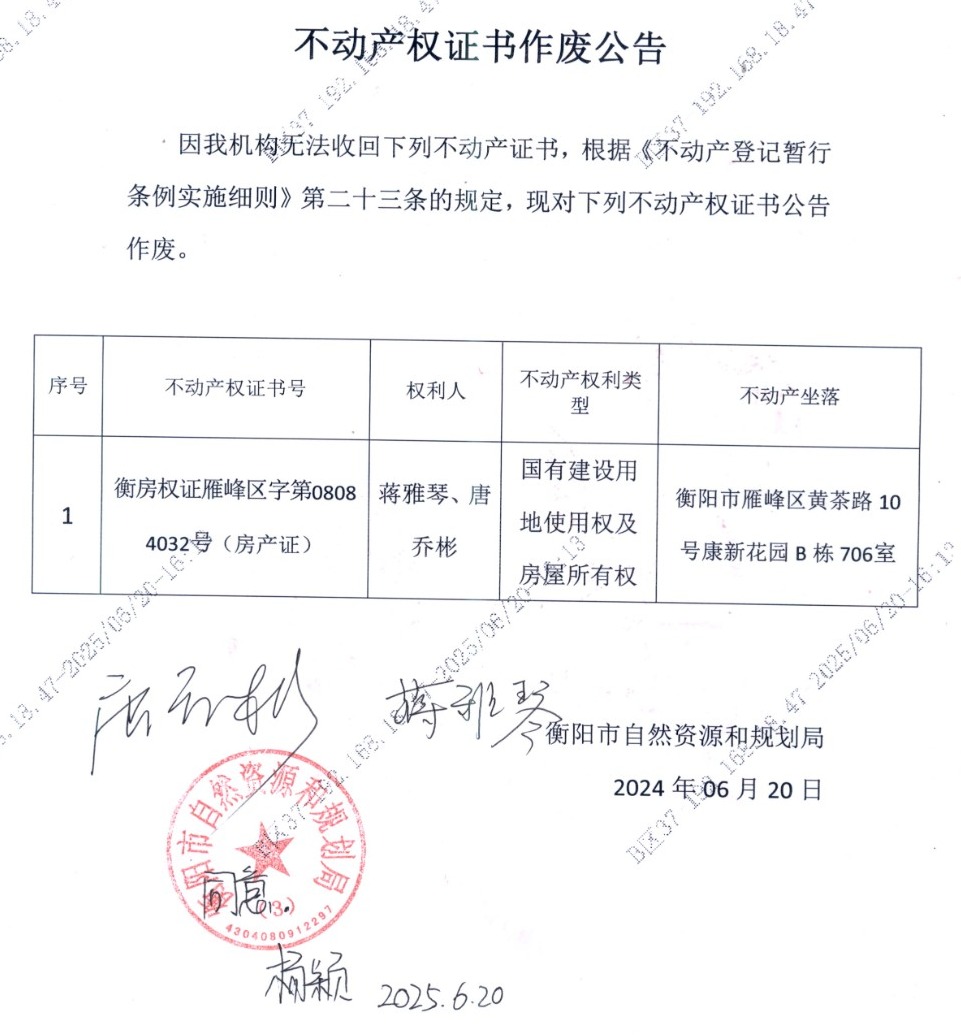 关于蒋雅琴、唐乔彬不动产权证书作废的公告