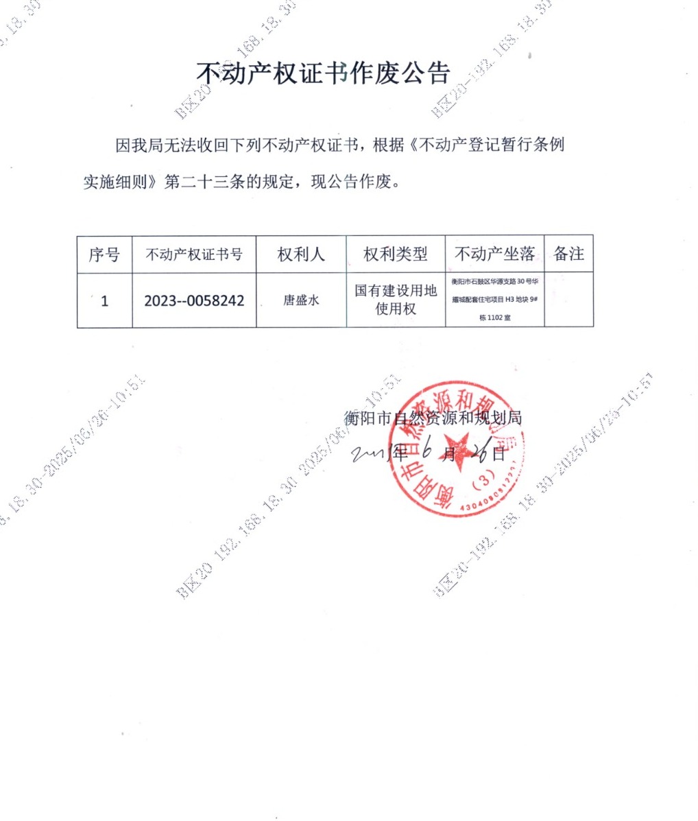 关于唐盛水不动产权证书作废的公告