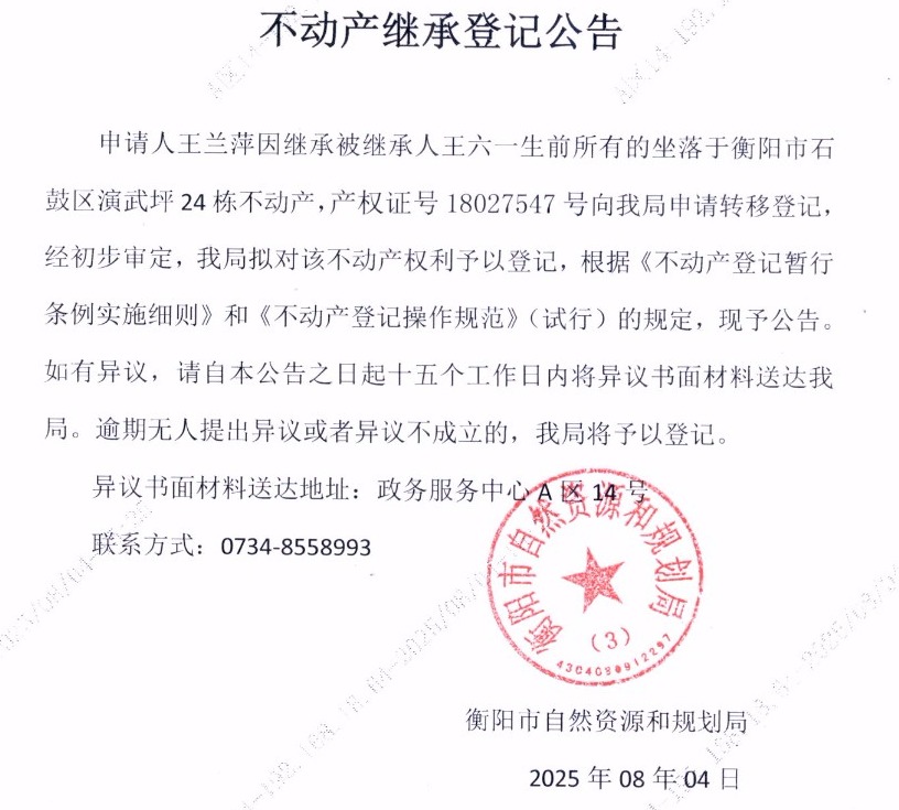 关于王兰萍继承王六一不动产登记的公告
