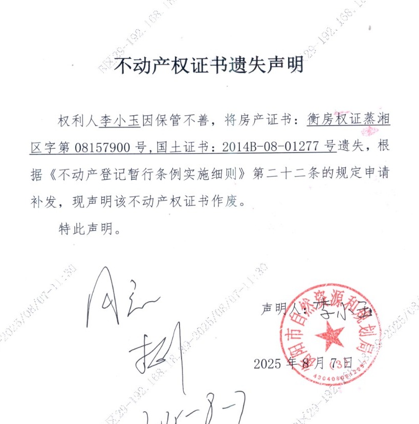 关于李小玉房产证国土证的遗失声明