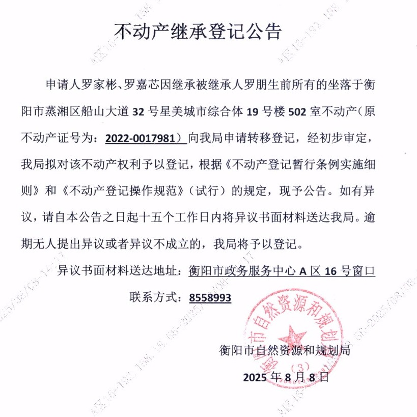 关于罗家彬、罗嘉芯继承罗朋不动产登记的公告