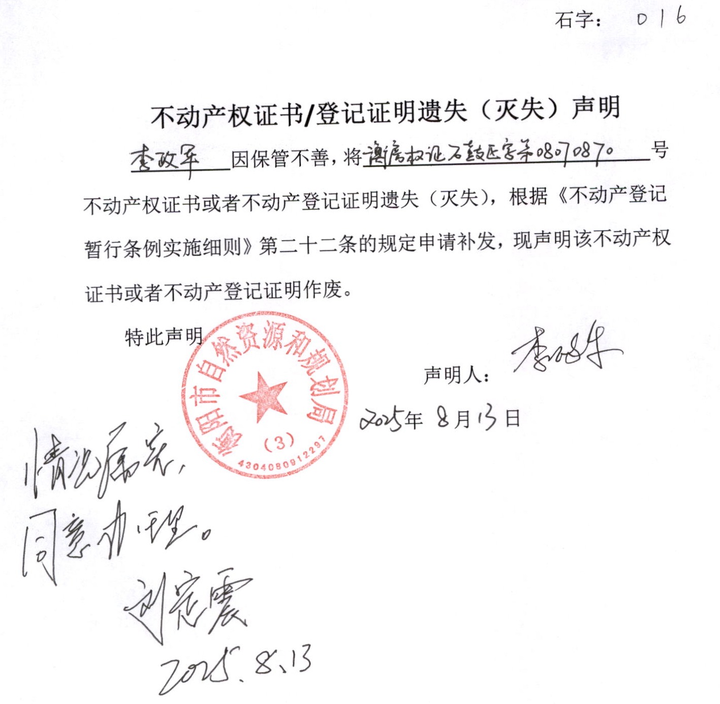 关于李政军房产证遗失补发声明的公告