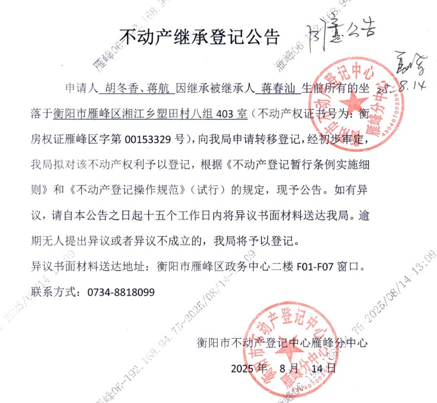 关于胡冬香、蒋航继承蒋春汕不动产登记的公告