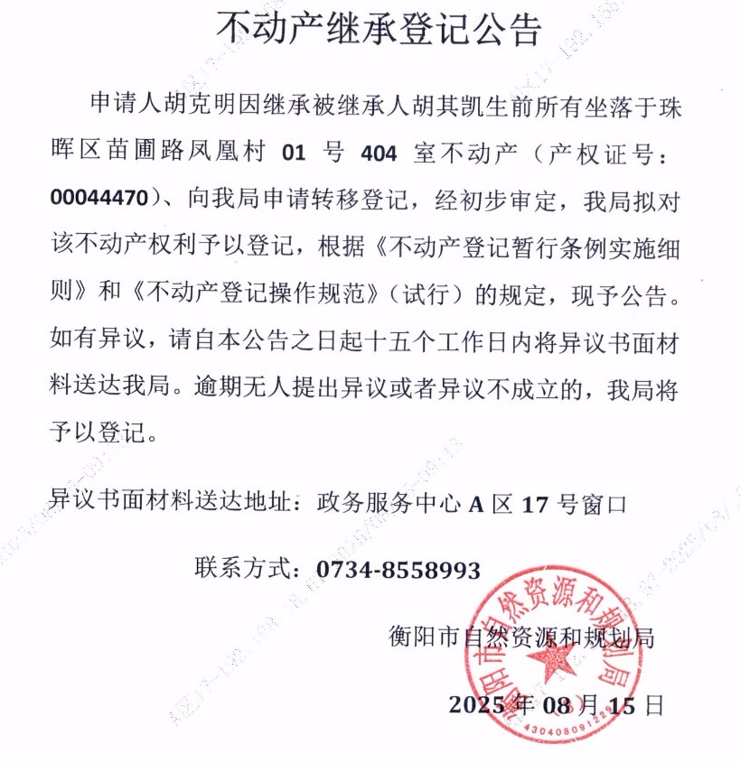 关于胡克明继承胡其凯不动产登记的公告