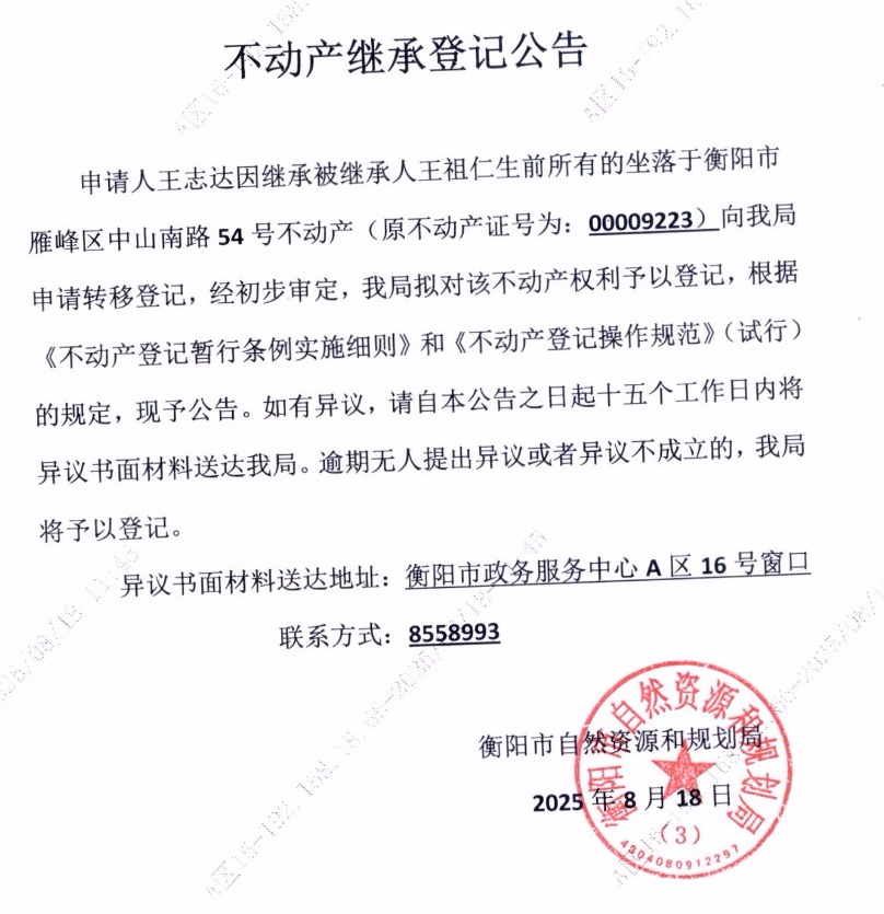 关于王志达继承王祖仁不动产登记的公告