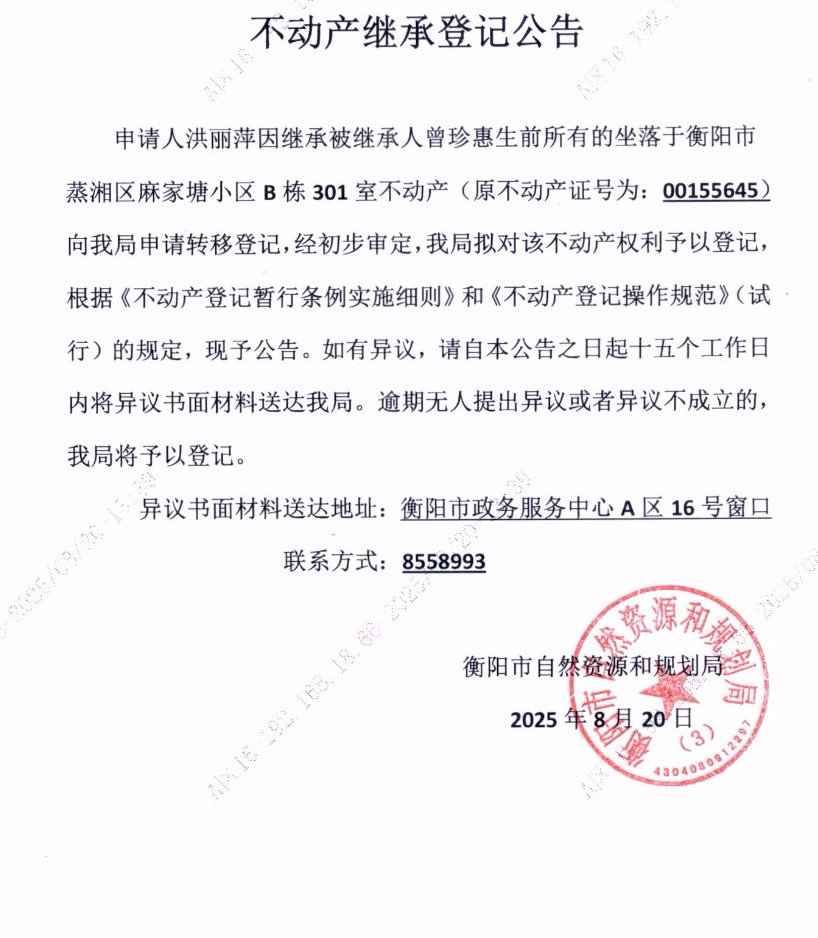 关于洪丽萍继承曾珍惠不动产登记的公告