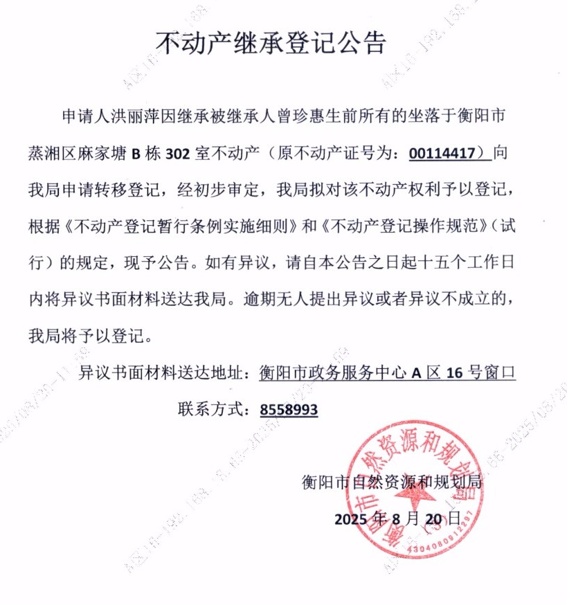 关于洪丽萍继承曾珍惠不动产登记的公告