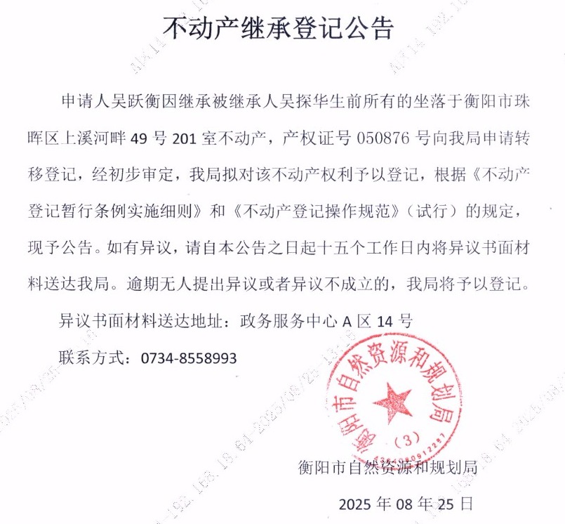 关于吴跃衡继承吴探华不动产登记的公告