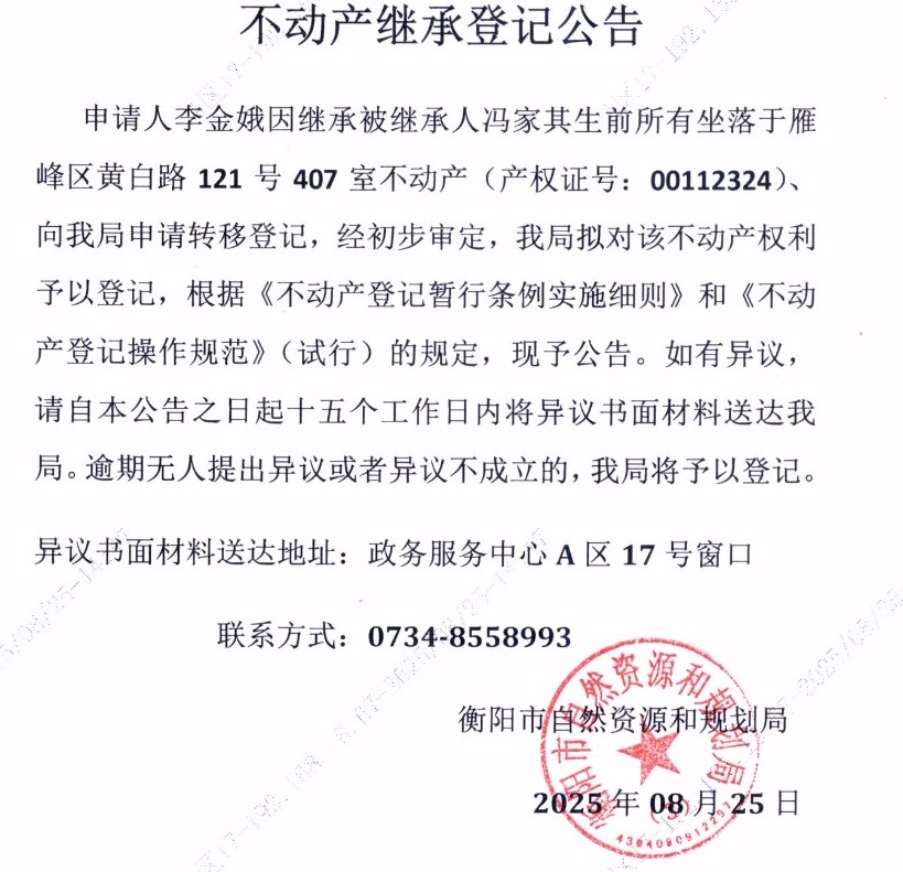 关于李金娥继承冯家其不动产登记的公告
