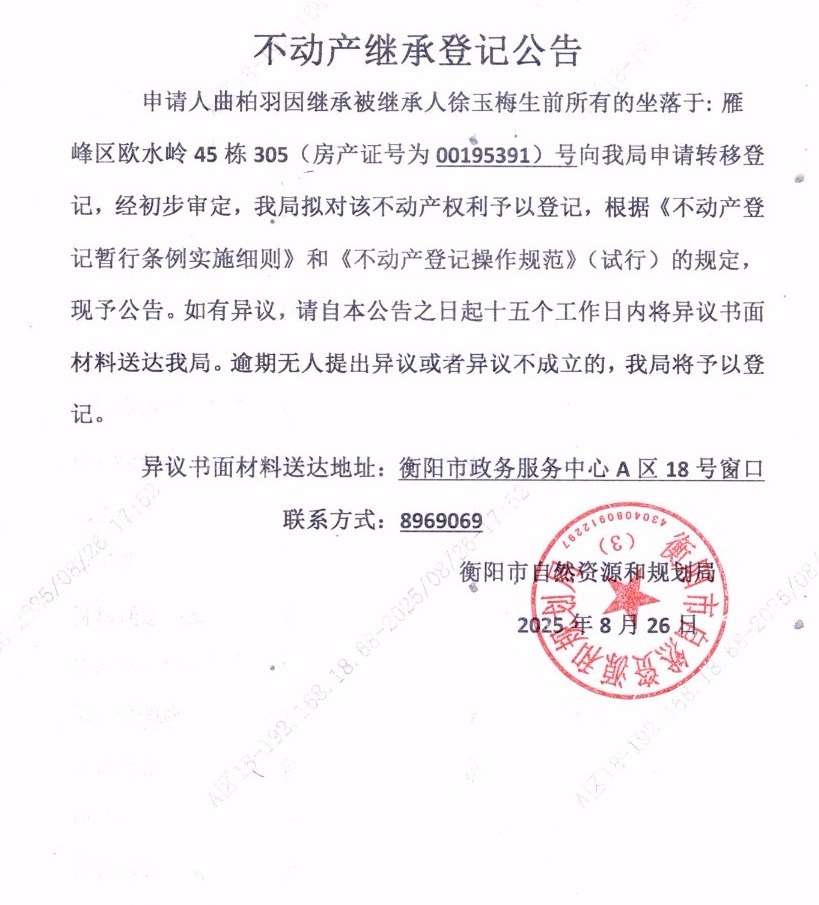 关于曲柏羽继承徐玉梅不动产登记的公告