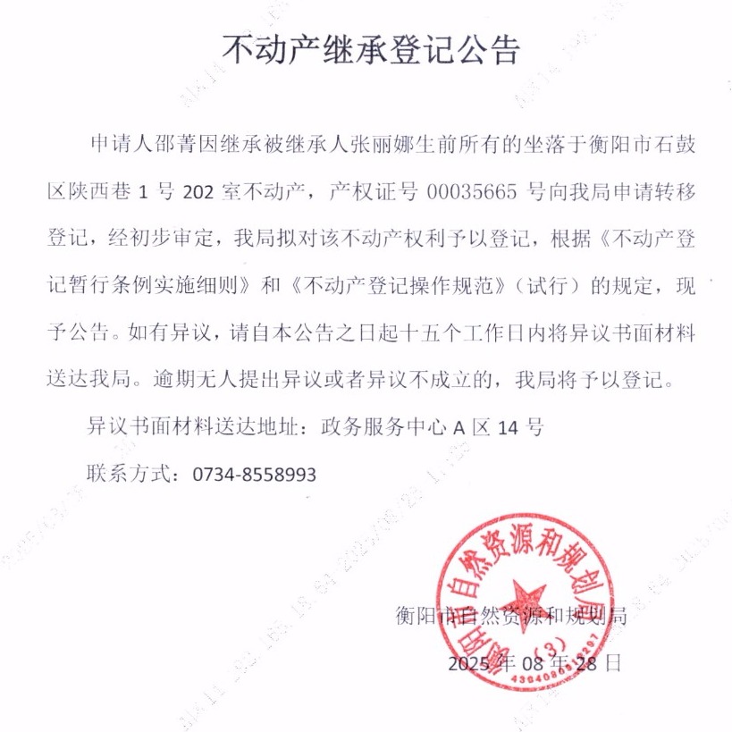 关于邵菁继承张丽娜不动产登记的公告