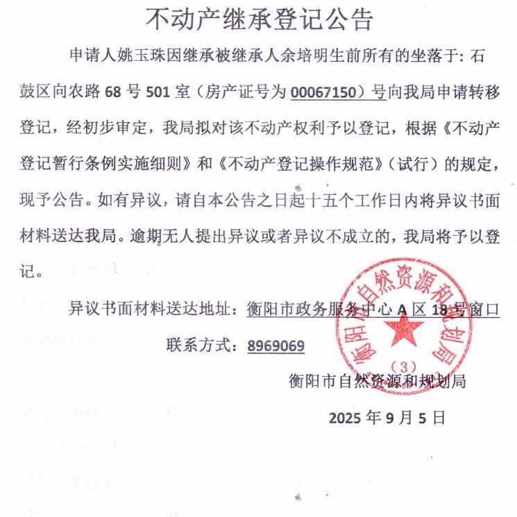 关于姚玉珠继承余培明不动产登记的公告