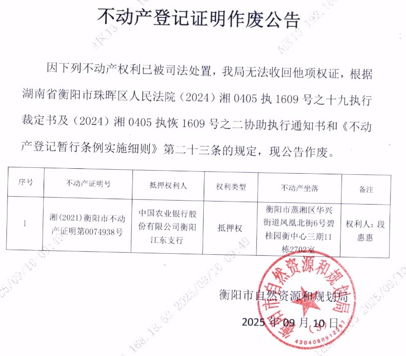 关于中国农业银行股份有限公司衡阳江东支行不动产登记证明作废公告