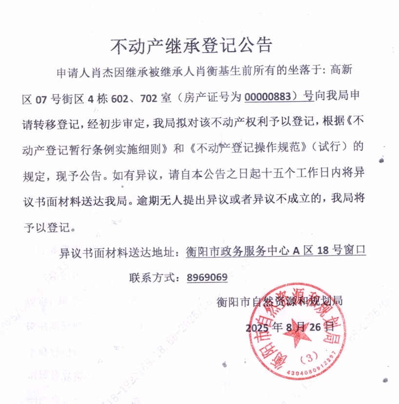 关于肖杰继承肖衡基不动产登记的公告