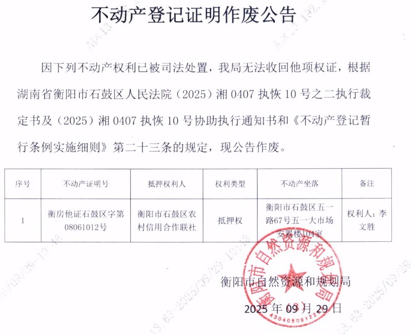 关于衡阳市石鼓区农村信用合作联社不动产登记证明作废公告