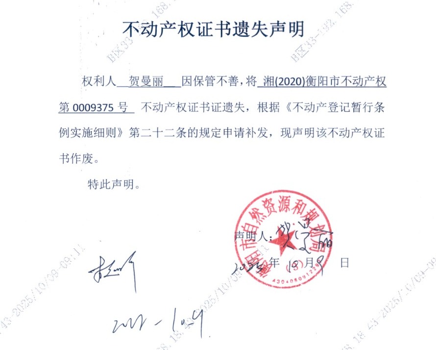 关于贺曼丽不动产证书遗失声明的公告