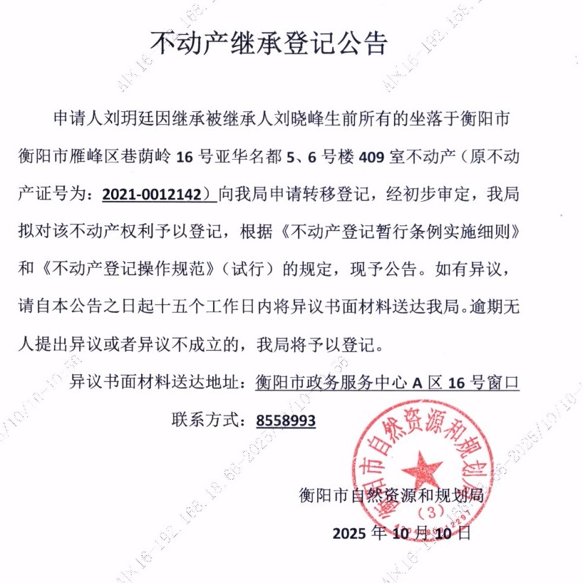 关于刘玥廷继承刘晓峰不动产登记的公告