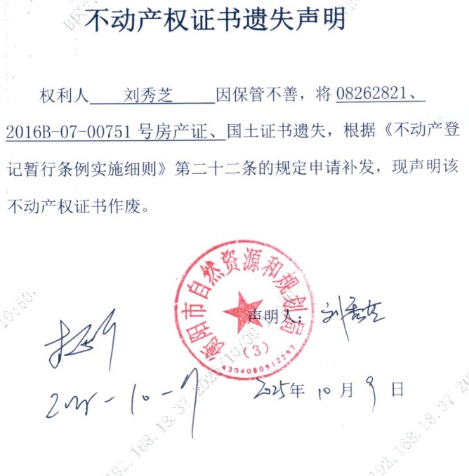 关于刘秀芝不动产权证书遗失声明的公告