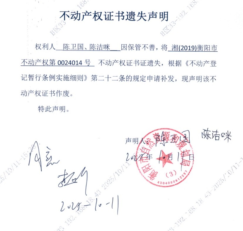 关于陈卫国、陈洁咪不动产证书遗失声明的公告