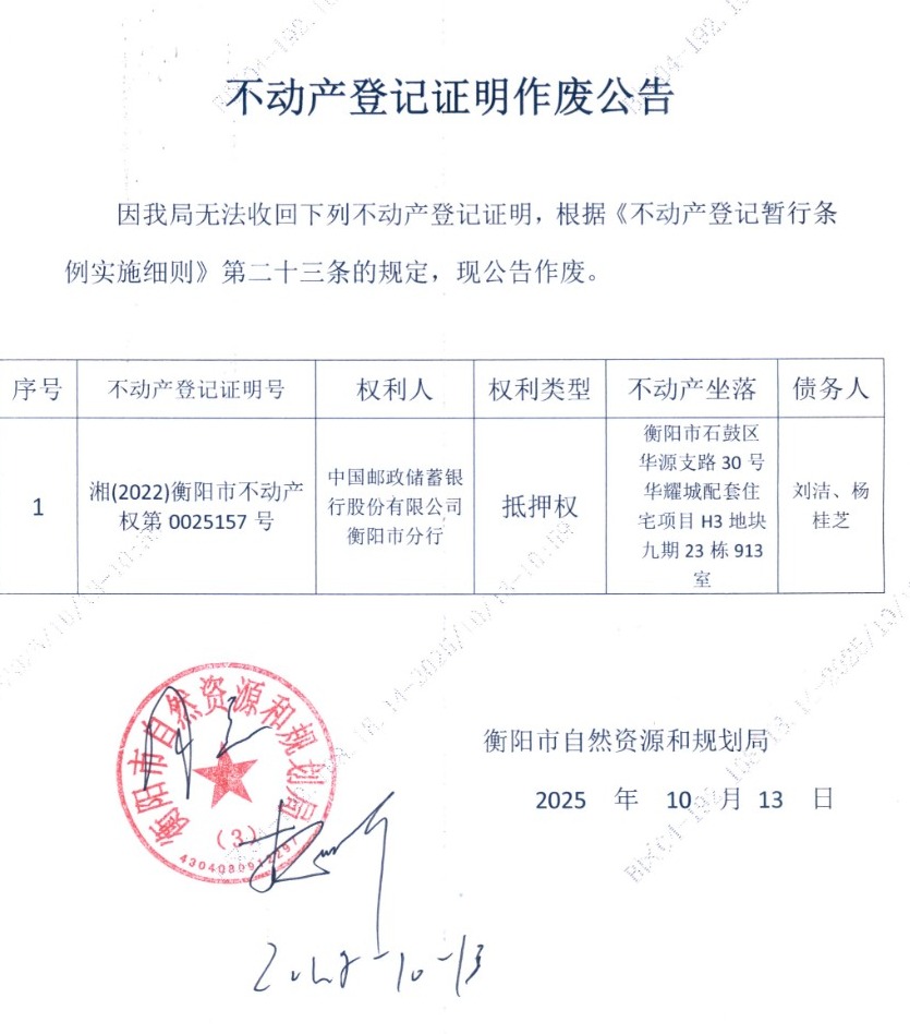 关于中国邮政储蓄银行股份有限公司衡阳市分行不动产登记证明作废公告