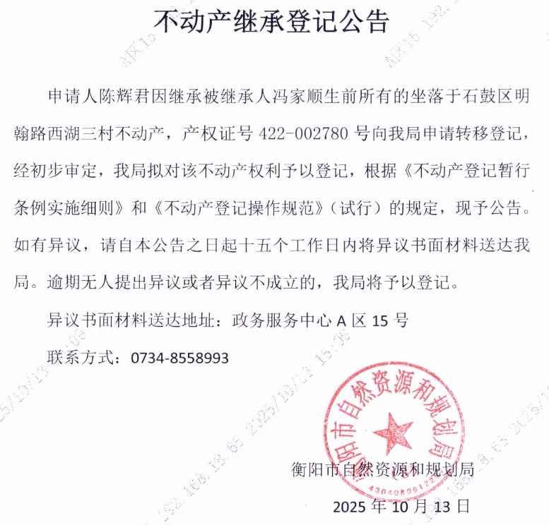 关于陈辉君继承冯家顺不动产登记的公告