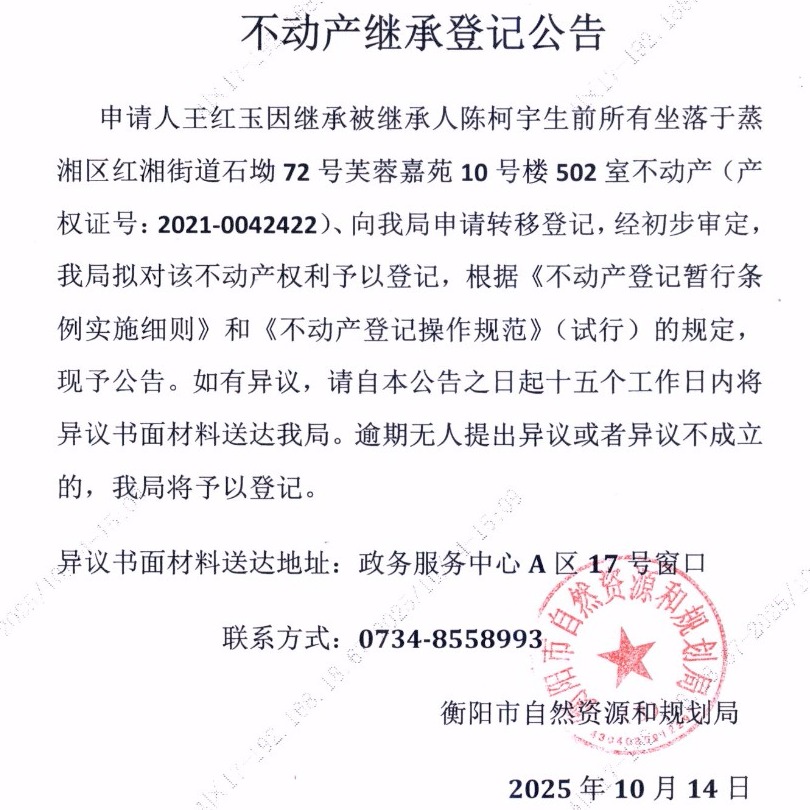 关于王红玉继承陈柯宇不动产登记的公告