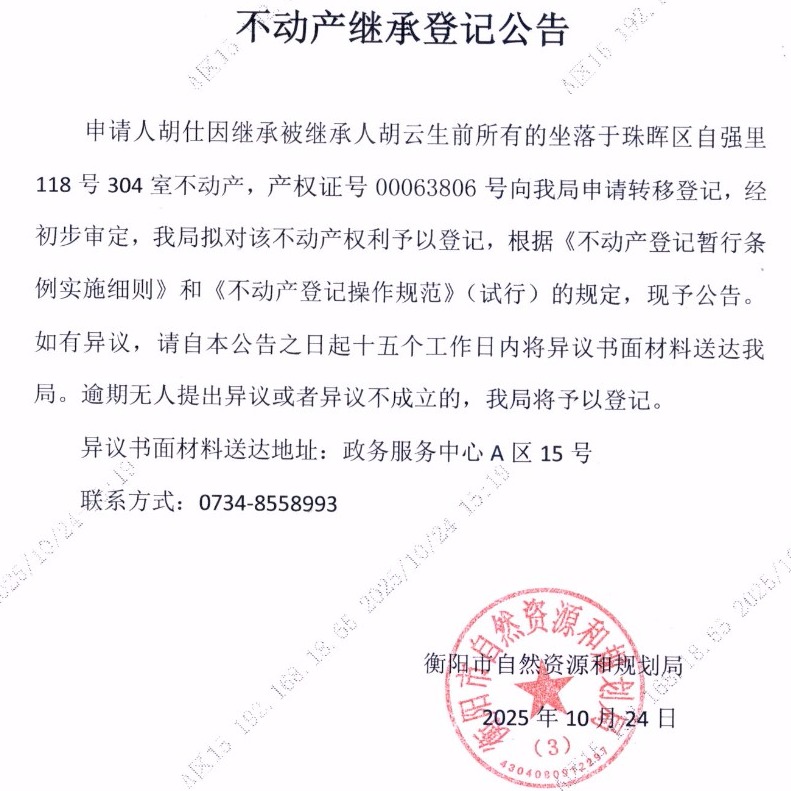 关于胡仕继承胡云不动产登记的公告