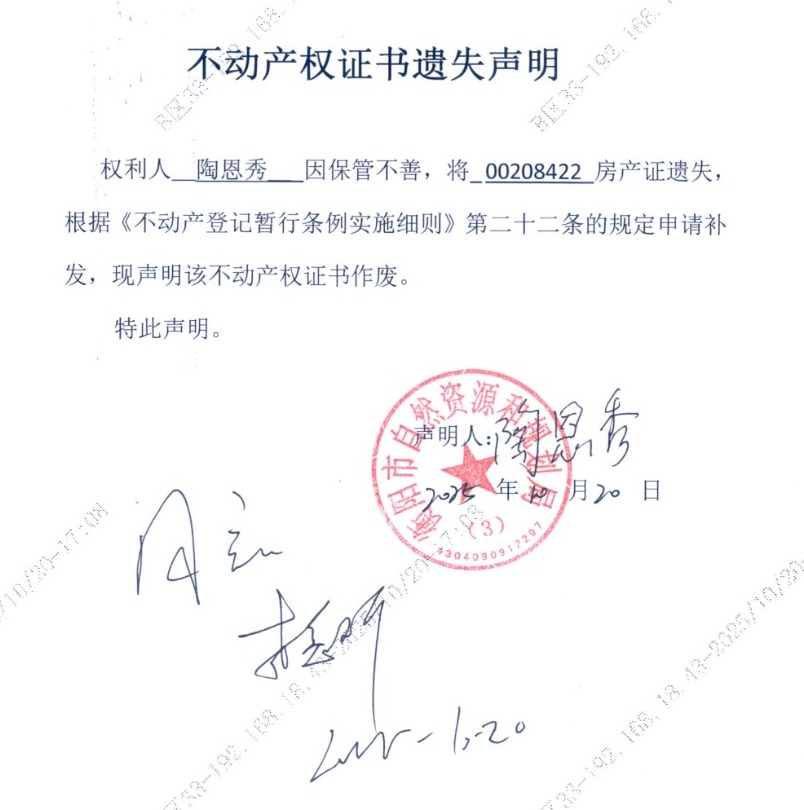 关于陶恩秀房产证遗失声明的公告