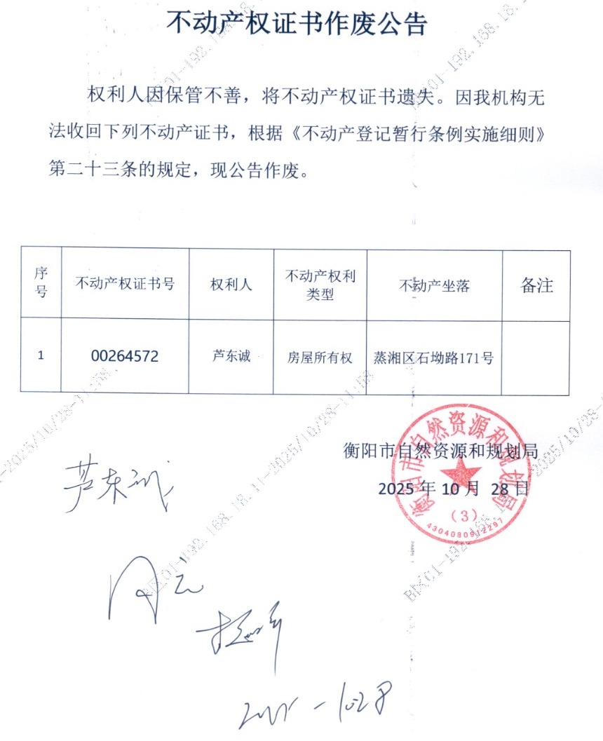 关于芦东诚房产证作废公告