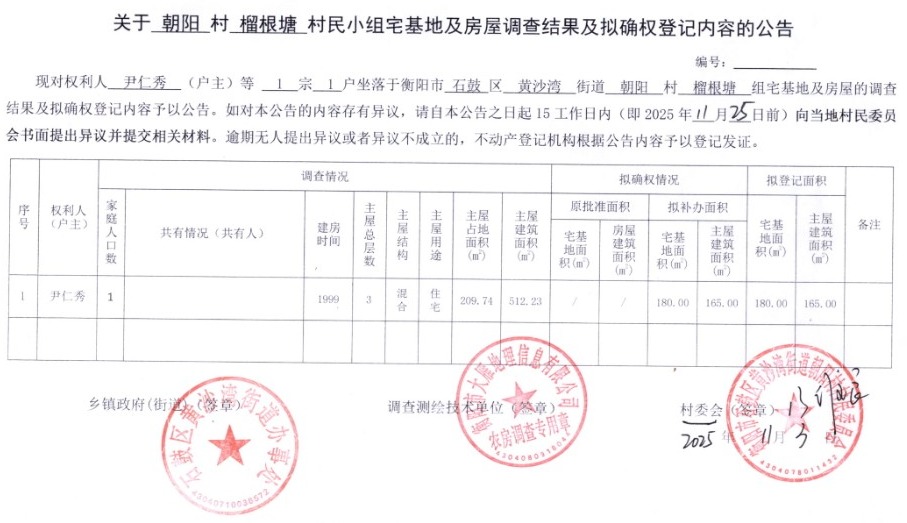 关于朝阳村榴根塘村民小组宅基地及房屋调查结果及拟确权登记内容的公告